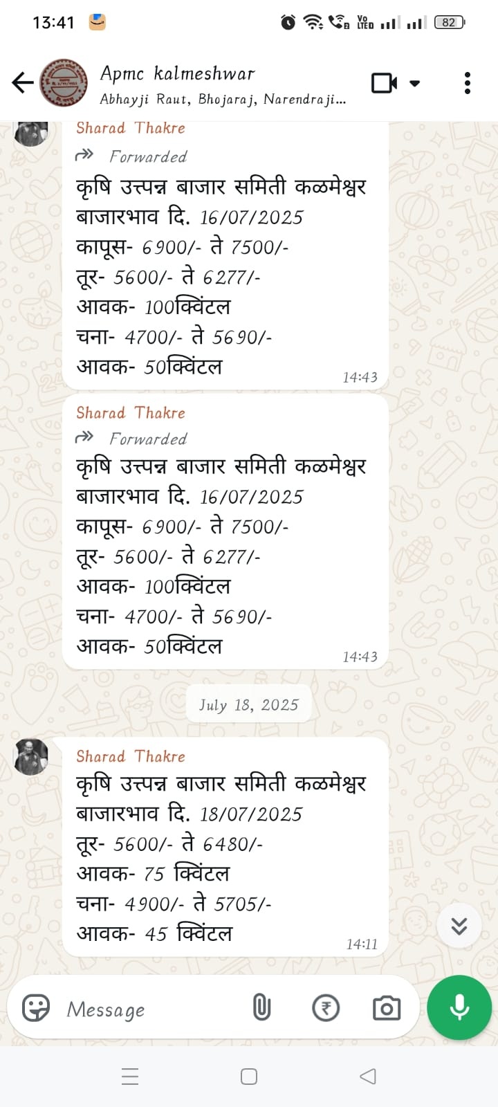 व्हॉट्स अप संदेश तर्फे बाजार भावाची माहिती पुरविण्यात येते.